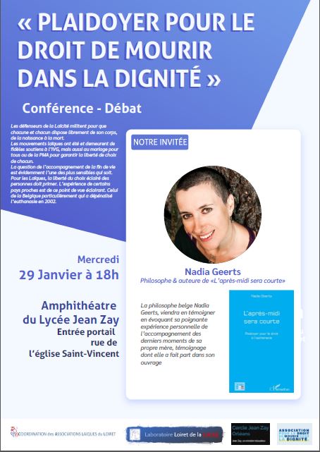 Le Laboratoire Laïcité du Loiret, l’Association départementale pour le droit à mourir dans la dignité, le Cercle Jean Zay d’Orléans, et la Coordination des associations laïques du Loiret vous invitent à une conférence-débat (entrée gratuite) sur le thème :