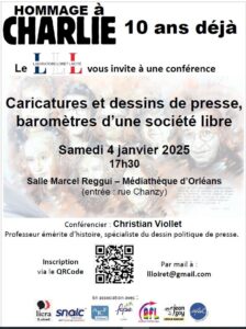 1. Conférence consacrée aux caricatures et dessins de presse le samedi 4 janvier 2025 C‘est pour rappeler l’histoire française de la caricature et du dessin de presse, en hommage aux victimes des attentats du 7 janvier 2015, et particulièrement à tous ceux qui périrent dans les locaux de Charlie Hebdo, que le Laboratoire Loiret de la Laïcité organise le samedi 4 janvier 2025 à 17h30 à la Médiathèque d’Orléans, une conférence publique intitulée : » Caricatures et dessins de presse, baromètres des libertés » Le conférencier, Christian Viollet professeur émérite d’histoire, spécialiste du dessin politique de presse. Ami personnel de Cabu, il fréquentait assidument la salle de rédaction de Charlie Hebdo jusqu’au fatal jour du 7 janvier 2015… Conférence gratuite ouverte au public. Le nombre de places étant limité, l’inscription préalable est conseillée en cliquant sur le QR Code de l’affiche ci-dessous ou par courriel à llloiret@gmail.com2. Hommage aux victimes des attentats de janvier 2025, mardi 7 janvier 2025, place de la République à 17h30 à Orléans Dix-sept personnes ont perdu la vie entre le 7 et le 9 janvier 2015, victimes de terroristes islamistes. Les assassins ont visé la rédaction du journal Charlie Hebdo, des policiers et les clients d’un magasin casher. Pour leur rendre hommage une manifestation statique aura lieu le mardi 7 janvier 2025, place de la République à Orléans, à partir de 17h30. Elle démontrera que les orléanais sont « toujours Charlie », même 10 ans après, car les menaces contre la démocratie et contre les libertés sont toujours là. Rendez-vous le mardi 7 janvier 2025, place de la République, à 17h30, pour une manifestation statique, en hommage aux victimes de 2015.
