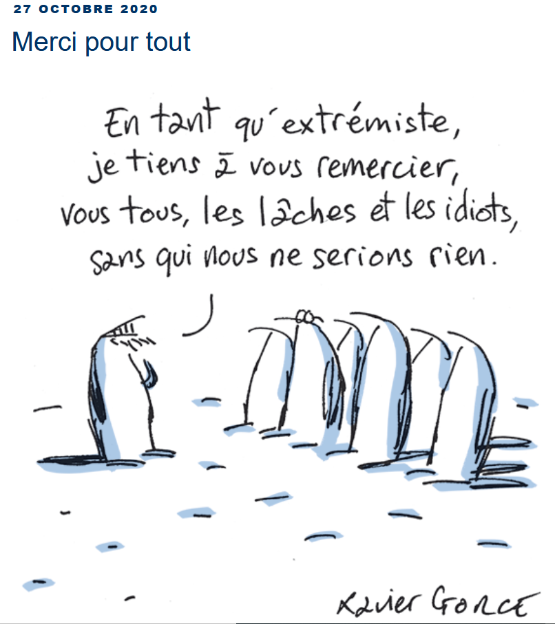 À côté de ceux-là, il y a bien sûr, ceux qui sont Samuel Paty. Mais pas avec moi, quand même, faut pas pousser… Les uns parce qu’ils ont peur, sans doute. Peur de s’afficher avec moi, parce que quand on voit ce que ça suscite, il vaut mieux rester au balcon, n’est-ce pas ? Certains l’ont exprimé : si n’importe qui d’autre avait publié pareil post, il n’aurait pas suscité ces réactions. Mais c’était moi…